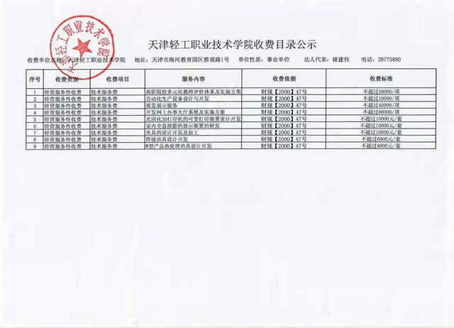 天津轻工职业技术学院收费目录公示
